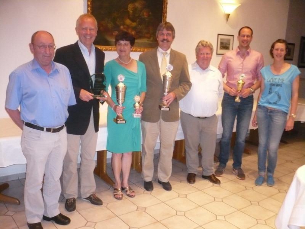 Siegerehrung (v.l.n.r): Moltorflugreferent "Kalle" Bender, Helmut Bäder Astrid Ciesielski, Marcus Ciesielski, HLB-Präsident Gerrd Hollstein, Robert Deppe und Carla Moses.