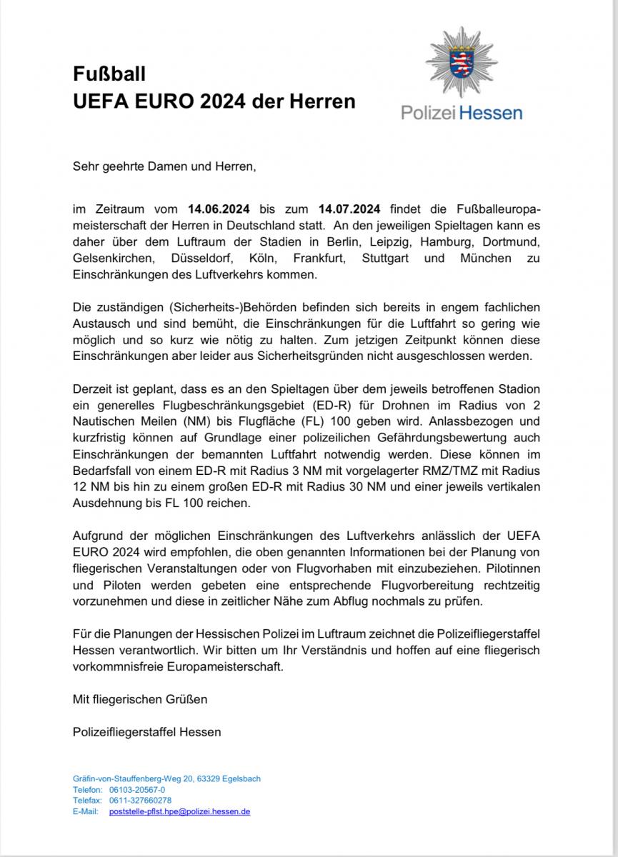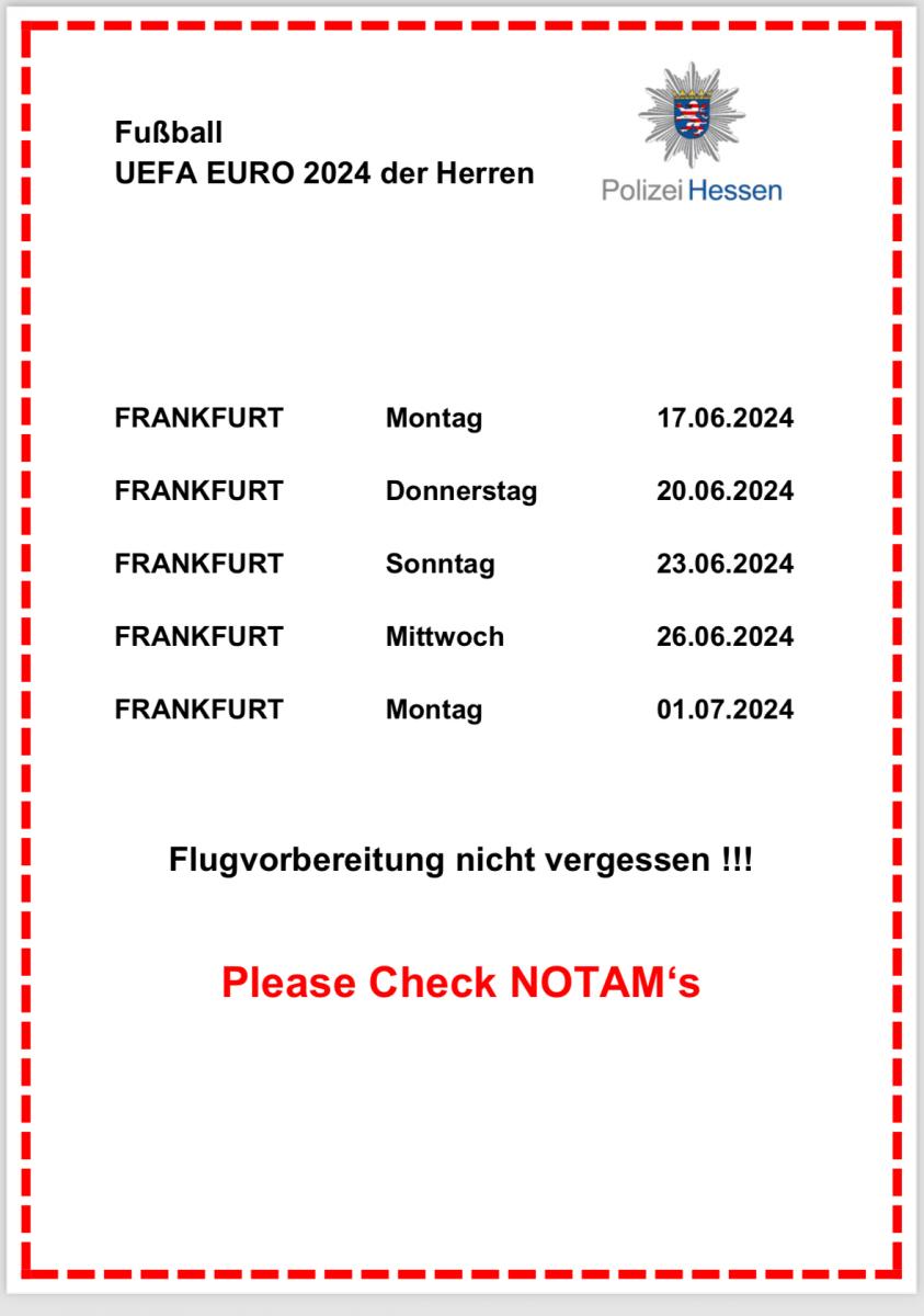 Die RPs bitten um Beachtung - Fußball UEFA EURO 2024 - Bitte auch auf den Flugplätzen aushängen Weiterlesen ... über Die RPs bitten um Beachtung - Fußball UEFA EURO 2024 - Bitte auch auf den Flugplätzen aushängenNews von Susan BreitenbachZum Verfassen von Kommentaren bitte Anmelden oder Registrieren.