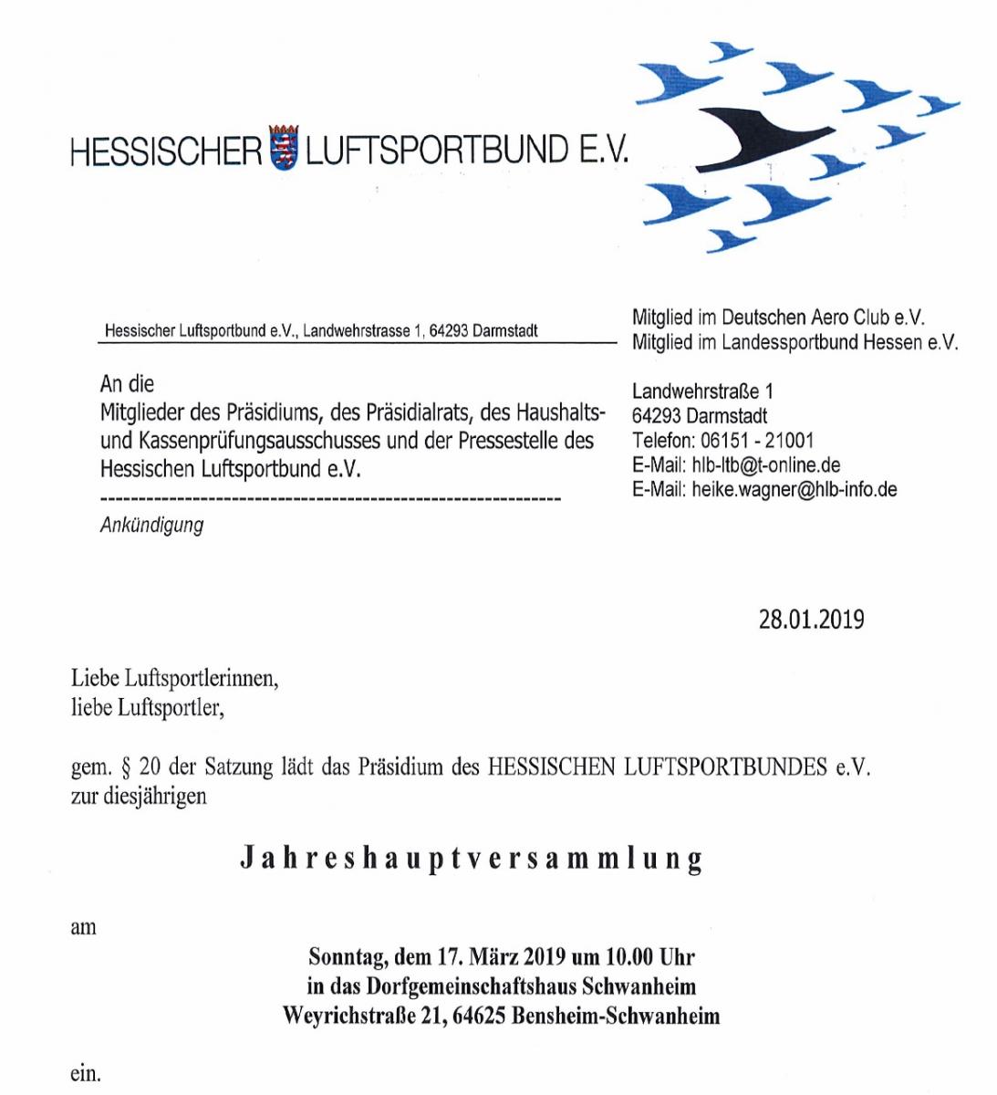 Der Hessische Luftsportbund lädt ein zu seiner diesjährigen Jahreshauptversammlung. Hier findet Ihr das komplette Einladungsschreiben des HLB sowie der SFG Bensheim e.V. mit weiteren Informationen zum traditionellen Treffen am Vorabend der Hauptversammlung und Infos zum Rahmenprogramm..
