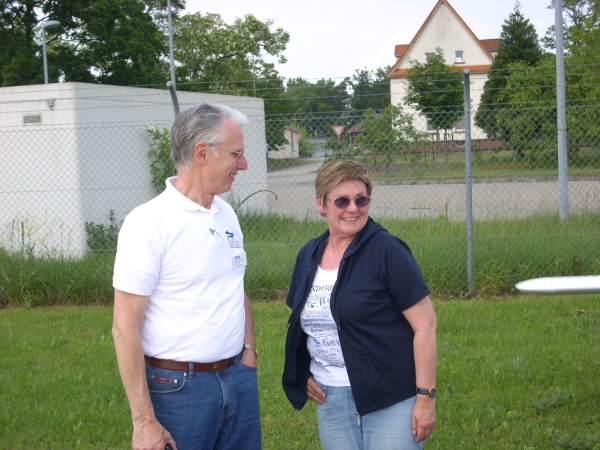 Gary Gray vom Förderverein Luftfahrtmuseum August Euler e.V. im Gespräch mit Renate Heege, die zusammen mit ihrem Mann Klaus den 6. Platz beim 50. Hessensternflug belegte.