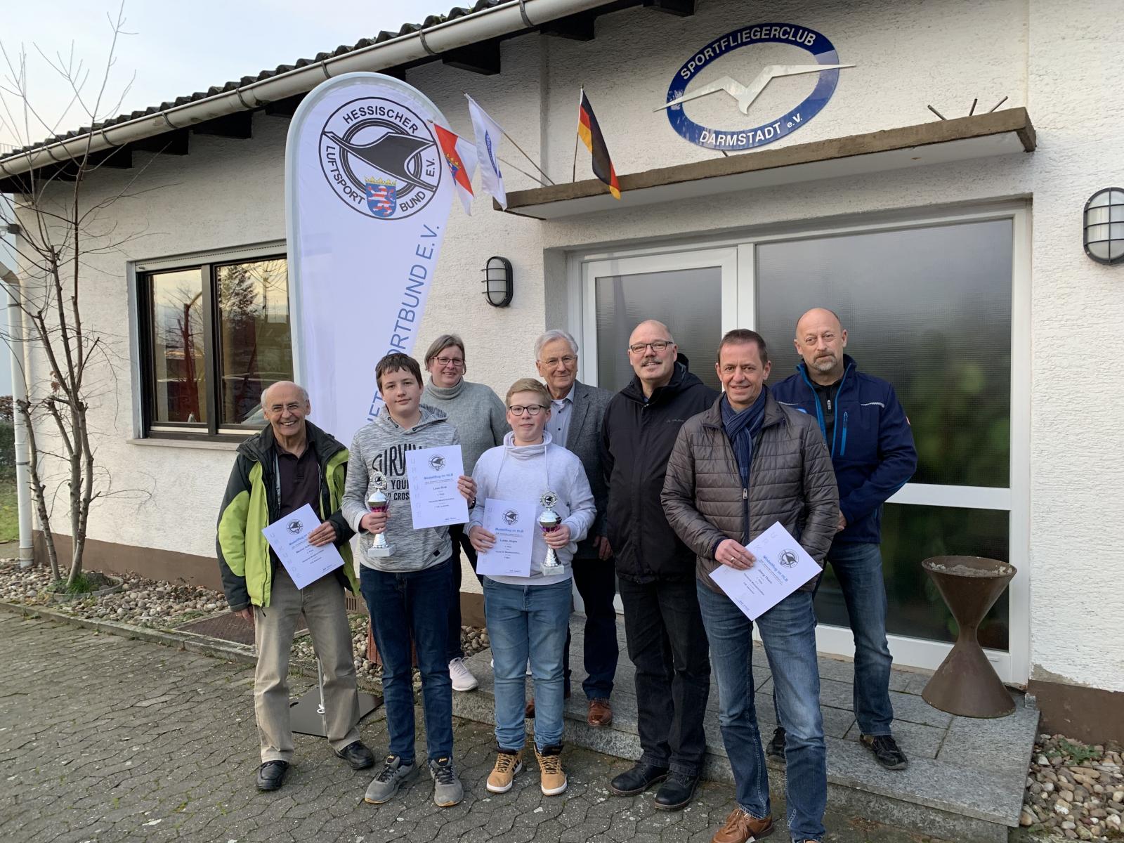Werner Ackermann, Leon Rink, Landesmodellflugreferentin Heike Kordubel, Lukas Jörges, Stlv. Präsident HLB Hans Kordubel, Thomas Lader, Jörg Thorn und SFC Gastgeber Oliver Burkardt.