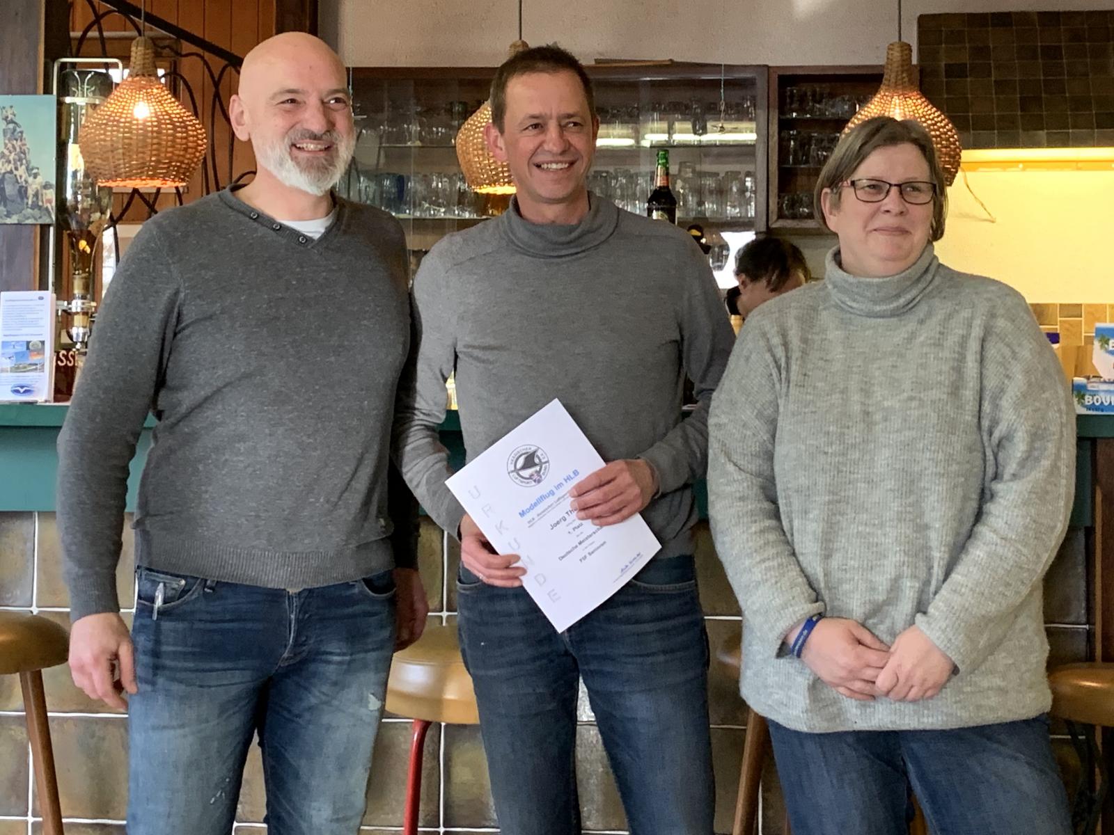 Markus Rink (l.) mit Jörg Thorn (m.) 1. Platzierter in der Klasse F3F Senioren und Heike Kordubel (r.) Landesmodellflugreferentin.