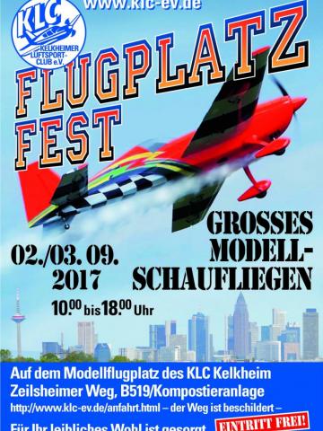 auf unserem Modellflugplatz in 65779 Kelkheim/Taunus. Wer noch nicht bei uns in Kelkheim war, unser Platz liegt nordwestlich von Frankfurt, eingerahmt von der Kulisse der Frankfurter Skyline, des Rhein-Main Airports und des Großen Feldberges im Taunus. Wir verfügen über ein breite, gepflegte Rasenpiste. Es gilt die 25 kg Gewichts-Grenze. Das Flugprogramm startet an beiden Tagen ab 10.00 Uhr.
